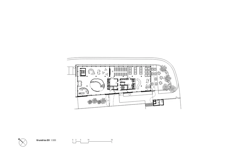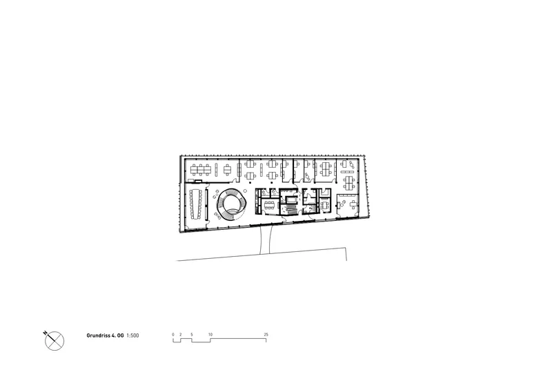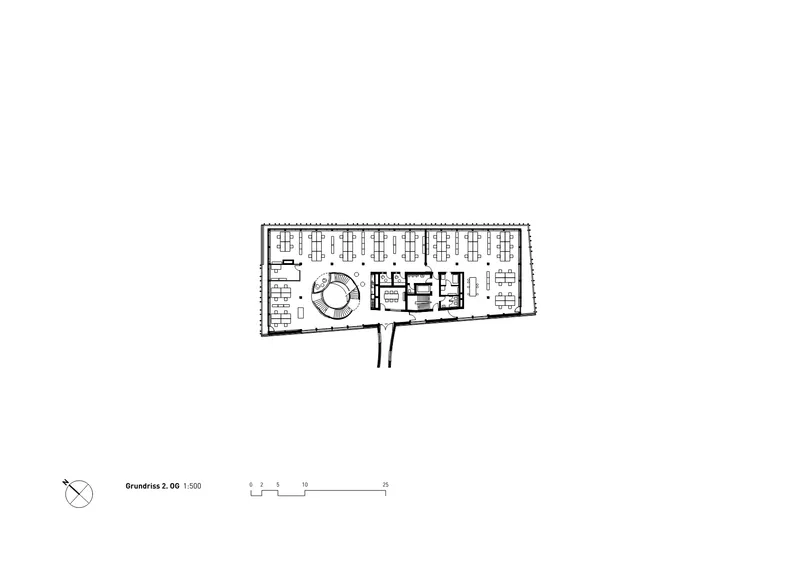 Das Gebäude vereint Büros, Empfang, Eventräume und Cafeteria. Transparente Grundrisse, flexible Arbeitsplätze und eine zentrale Treppenskulptur fördern Kommunikation, Orientierung und effiziente Abläufe für Mitarbeitende und Besucher. Offene Bereiche, Rückzugsorte, Begegnungszonen bieten den Mitarbeitenden individuelle Arbeitsformen. Die resiliente Struktur und flexible Organisation ermöglicht eine hohe Anpassungsfähigkeit an zukünftige Entwicklungen und Bedürfnisse.