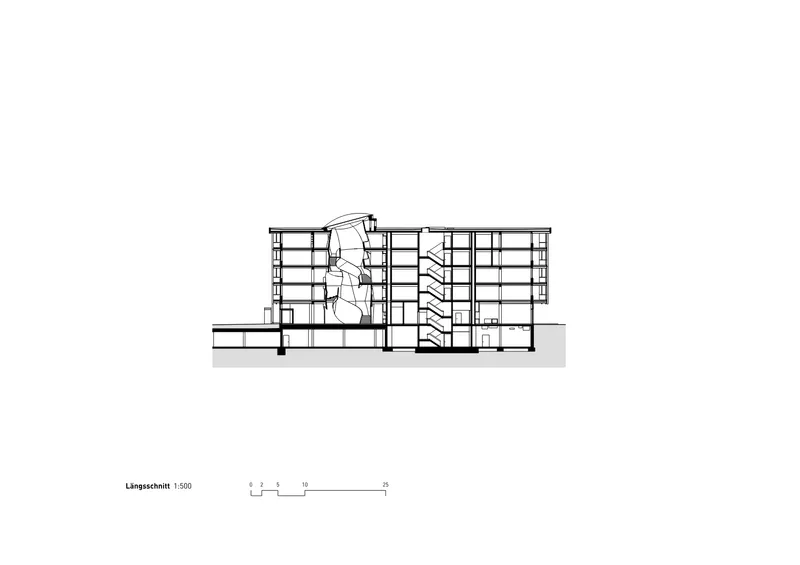 Im Zentrum des Gebäudes liegt ein geschossübergreifendes Atrium mit einer frei geformten Treppenskulptur aus gekrümmten Massivholzplatten. Diese entstand in enger interdisziplinärer Zusammenarbeit zwischen Architektur, Holzbauingenieurwesen, digitaler Planung, Forschung und industrieller Fertigung, insbesondere mit dem ICD Institut für Computerbasiertes Entwerfen und Baufertigung der Universität Stuttgart. Das innovative Flächentragwerk aus CLT curved übernimmt tragende Funktionen bei minimaler Materialstärke und demonstriert das strukturelle und gestalterische Potenzial gekrümmter Holzbauteile.