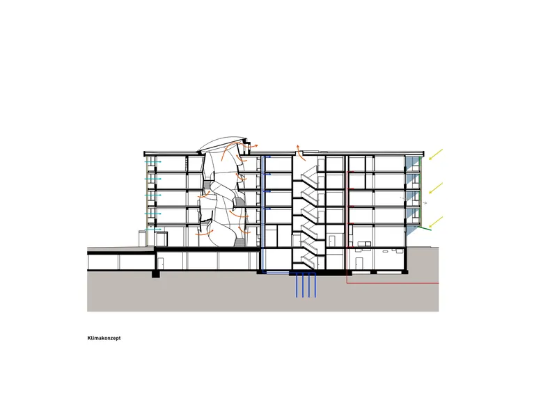 Ökologische Nachhaltigkeit zeigt sich im bewussten Verzicht auf aktive Kühlung und in einem Lowtech-Gebäudekonzept mit natürlicher Lüftung, Nachtauskühlung, geothermisch unterstützten Lehmkühldecken und wirkungsvollem Sonnenschutz durch umlaufende Balkone. Lehmwände verbessern das Raumklima und erhöhen die thermische Speicherfähigkeit.