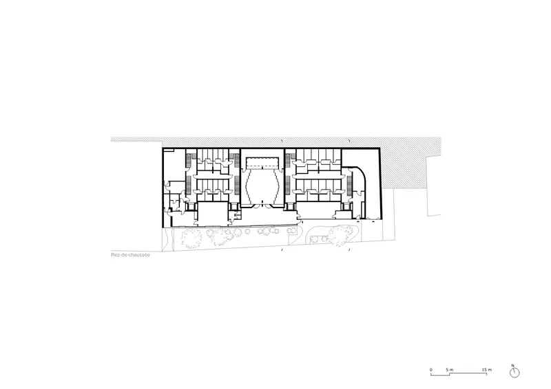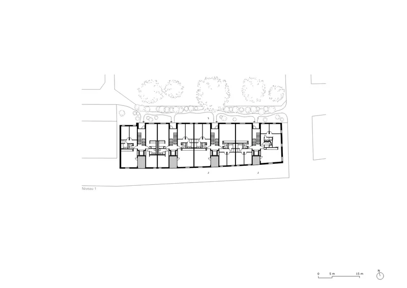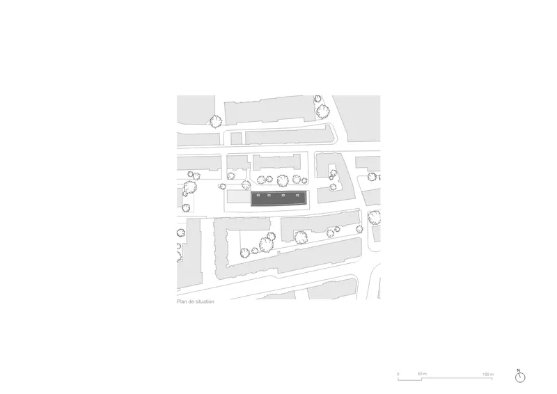 Le projet développe une architecture sobre et mesurée, attentive à la mémoire du site et à l’identité du quartier. Dans un contexte contraint par la densité bâtie, la proximité des vis-à-vis et une luminosité limitée, la conception offre des logements lumineux et généreux. La façade nord s’ouvre sur une vaste cour intérieure arborée, permettant lumière naturelle et vues dégagées.