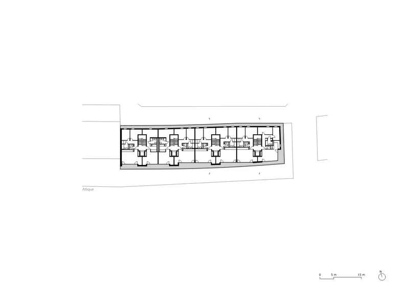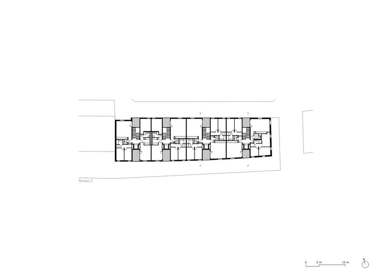 Le projet privilégie des solutions techniques sobres et efficientes : enveloppe performante, ventilation simple flux, production d’énergie renouvelable et toiture végétalisée. L’optimisation de l’apport de lumière naturelle dans un contexte dense contribue à réduire les besoins énergétiques et à améliorer le confort intérieur.