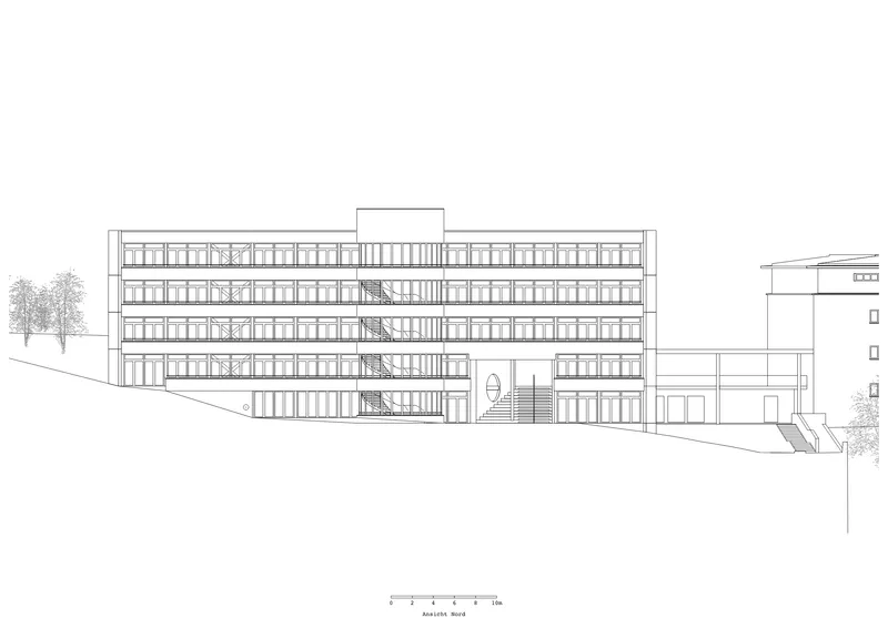 Der Neubau liegt geschickt im Terrain, drei Geschosse sind terraineben erschlossen. Davon profitieren die Werkräume im Untergeschoss, der Zugang für die Schüler*innen des Neubaus am Pausenplatz mit der Schülerbibliothek sowie der Kindergarten. Der Durchgang ist als gedeckte Pausenhalle mit Sitzstufen und Ein- / Durchblicken ins Foyer und die Bibliothek formuliert. Selbstbewusst verbindet das aussenliegende Treppenhaus alle Geschosse sowie die Lernlandschaft mit dem Gebäude. Die Topografie wird in allen Aspekten erlebbar. Die Schulgeschosse greifen als Einbünder mit Garderobenerschliessung und angelagertem Treppenhaus auf erprobte Schulhaustypologien zurück. Durch die klare Gebäudestruktur ist eine sehr hohe Flexibilität in der Nutzung entstanden, welche der Schule Raum für Entwicklung gibt.