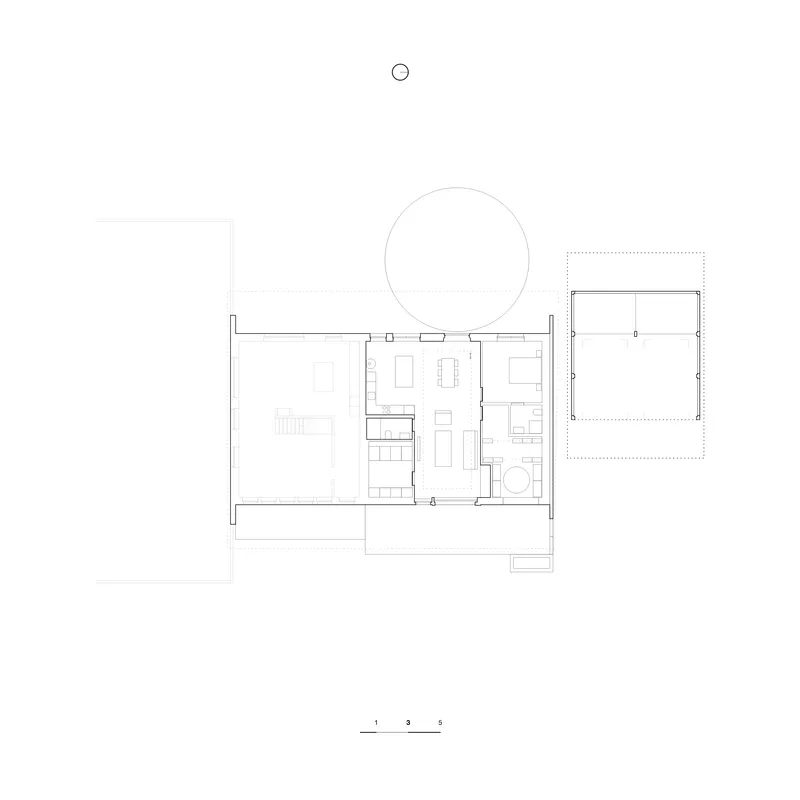 Il en résulte un plan triparti composé d’un espace de jour traversant qui occupe l’ancienne fourragère au centre, tandis que les espaces servants et les chambres se logent dans les trames structurelles de part et d’autre.