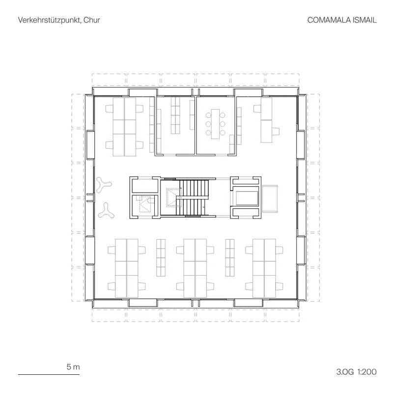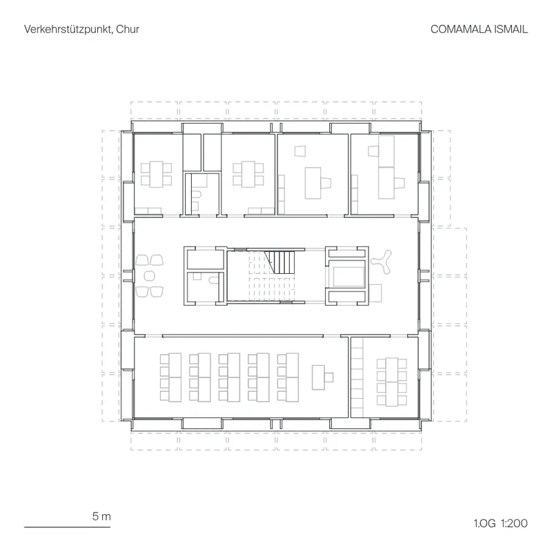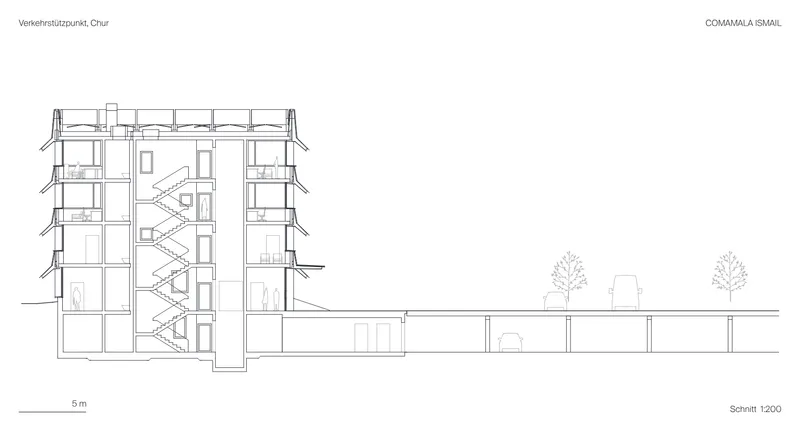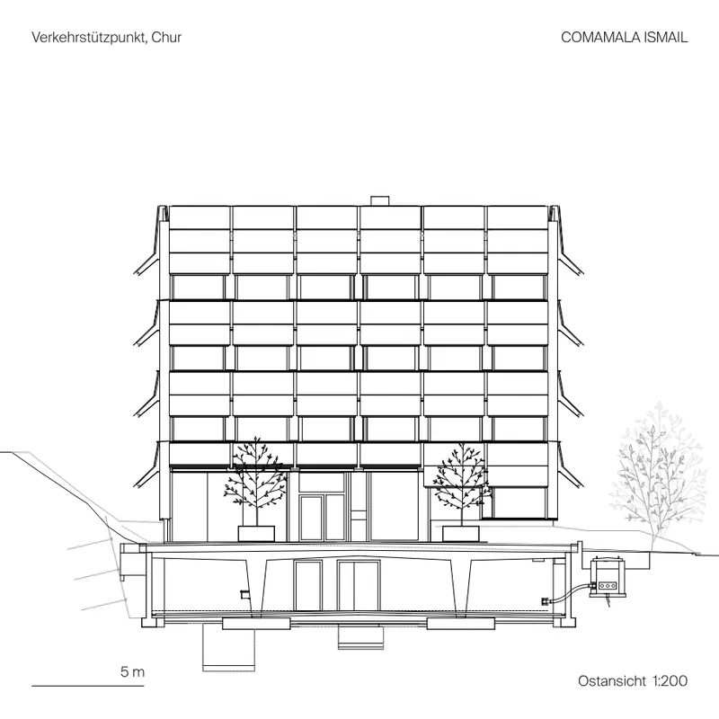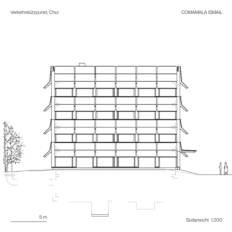 Der Verkehrsstützpunkt liegt sich auf einer von stark befahrenen Strassen isolierten Insel an der Autobahnausfahrt Chur Süd. Zusammen mit dem Werkhof bildet der Ort nun eine neue Symmetrie mit Eingangstor zum Quartier Rossboden.
