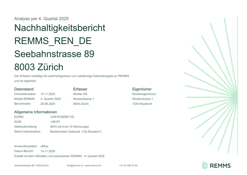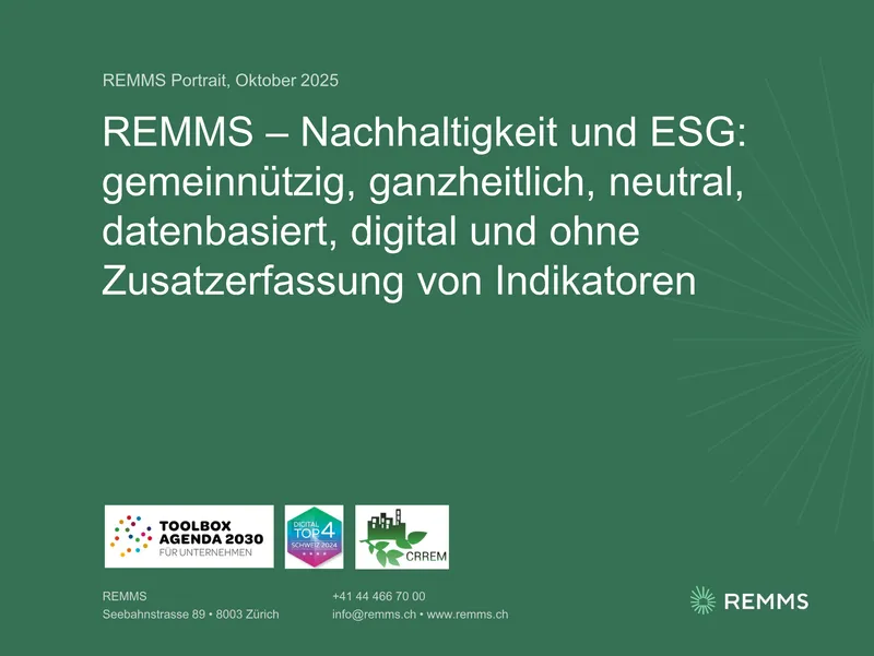 REMMS verfolgt das Ziel, Immobilienprojekte und bestehende Einzelimmobilien (Hochbau) sowie Immobilienportfolios in der Schweiz und neu auch in Deutschland und allenfalls später in weiteren Staaten bezüglich der Themen der Nachhaltigkeit – Ökonomie, Ökologie und Soziales – auf den Ebenen Ort, Umgebung und Gebäude datengestützt und objektiv im Sinne einer Standortbestimmung zu beurteilen.