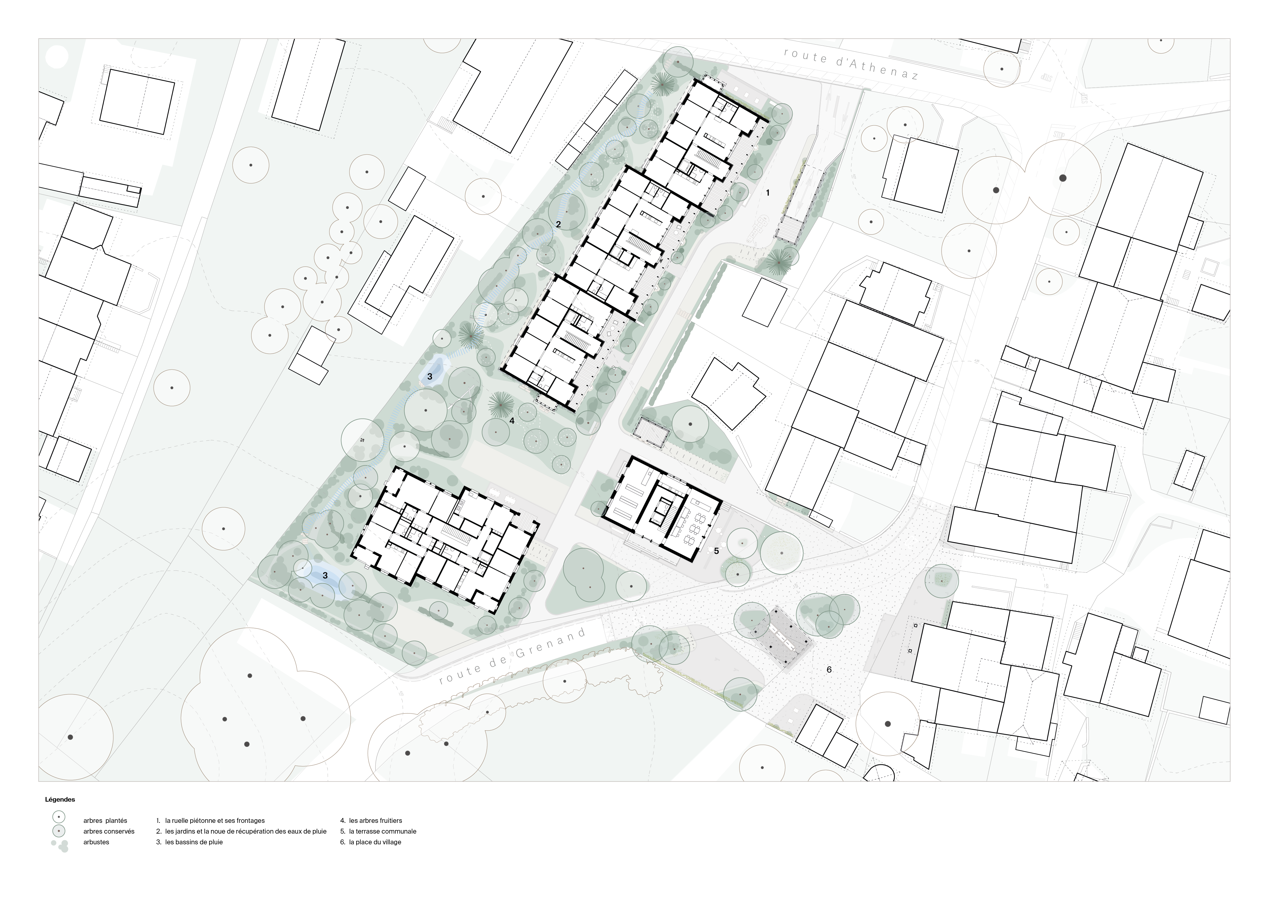 Le projet s’ancre dans une lecture fine du village d’Athenaz : morphologie bâtie, verger historique, topographie, espaces de transition. Il prolonge les logiques existantes de contiguïté, de décrochements et de relations à la rue. La pluralité des modes constructifs (briques, bois, terre) offre la diversité nécessaire à l'intégration des trois bâtiments, évitant la répétition. L’intervention ne cherche pas à s’imposer, mais à révéler et réorganiser un contexte déjà porteur de sens.