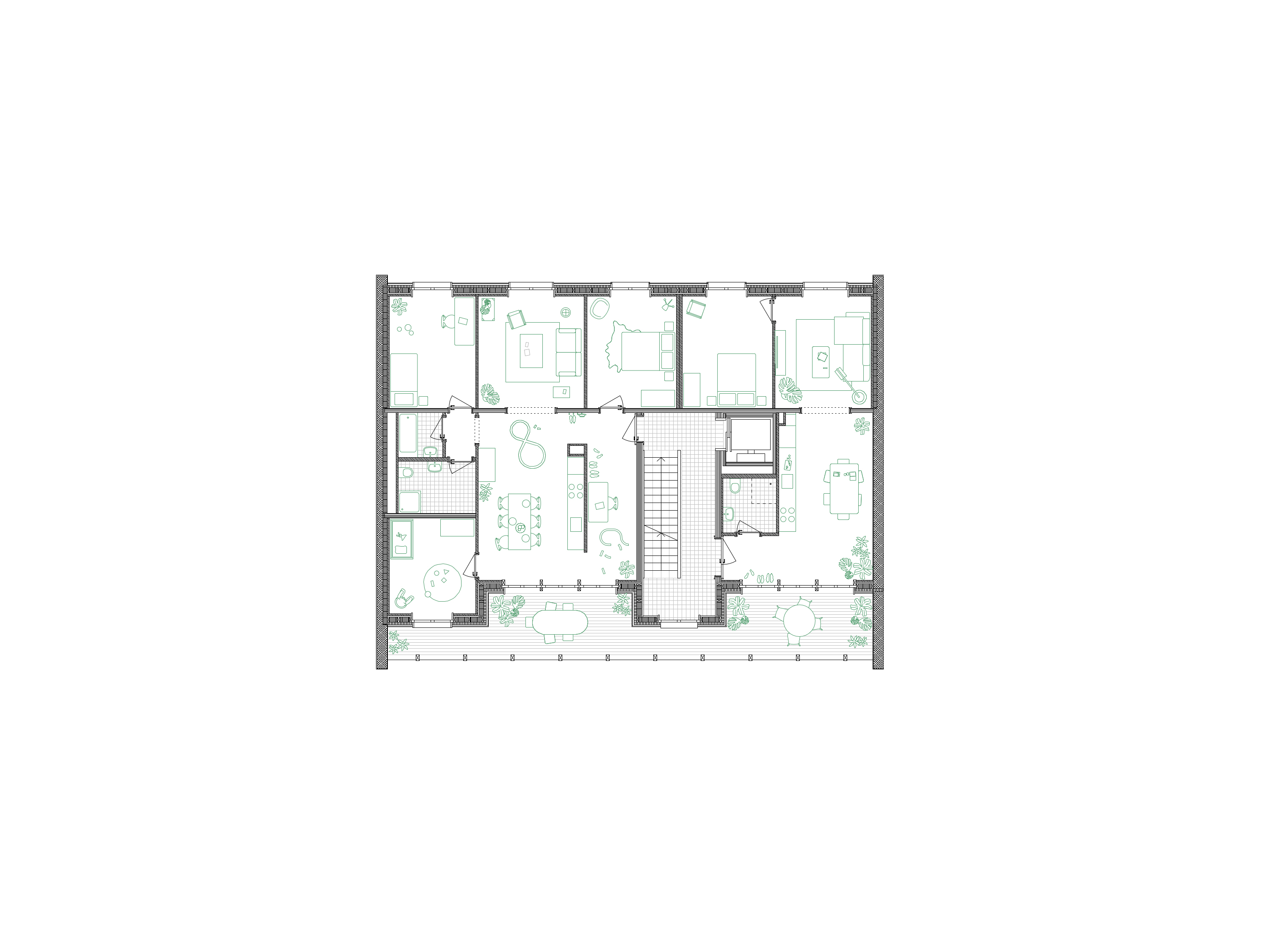Pensé comme un ensemble intergénérationnel, le projet articule logements, espaces partagés et activités publiques afin de favoriser l’ancrage, la proximité et l’autonomie locale. Il explore ainsi une manière contemporaine d’habiter la ruralité, attentive aux équilibres sociaux, écologiques et culturels du lieu, et ouverte à des usages évolutifs dans le temps.