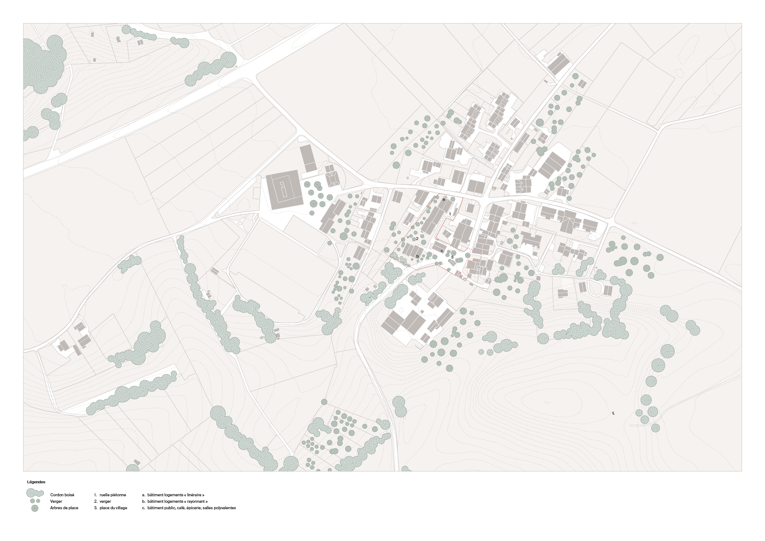 Trois dispositifs structurent le projet : une ruelle habitée, un verger central et une place du village. Ensemble, ils composent une armature paysagère et sociale qui réactive les formes de la vie collective. Les frontages plantés prolongent l’espace public jusque devant les façades et offrent des lieux d’appropriation, favorisant les rencontres informelles et les usages ordinaires. Le verger, conservé et renforcé, devient un commun productif et un paysage du quotidien. La place, animée par de nouvelles fonctions communales et commerciales, redonne une centralité au village.