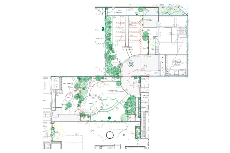 Im genauen Studium des Bestands wurde eine Logik gesucht, die sich für zeitgemässe Eingriffe weiterentwickeln lässt. Dies gilt sowohl für die gut sichtbaren Elemente (wie den Einbau der Theaterbox, den neuen Anbau eines Gartenzimmers, die Umgestaltung der Fassade am Hauptportal) als auch für die subtileren Elemente (Bartresen, neue Leuchten, Signaletik). Der Hof wurde in einen die Sinne anregenden Garten transformiert, der von der Tagesstätte für demenzkranken Menschen intensiv genutzt wird.