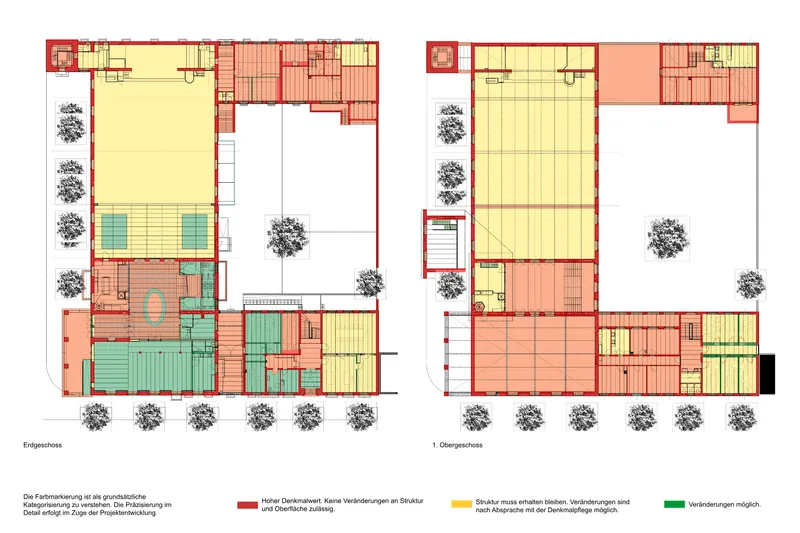 Das Projekt fokusiert auf die Qualitäten des vorgefunden Ensembles und steigert sie durch neue Eingriffe: neue Türen und das Bistro im EG öffnen das Gebäude zum Platz mit einer einladenden Geste. Der Hof wird einerseits als Werkstatthof gedeutet und andererseits als grosser Garten gestaltet- ein Verweis auf Vereinbarkeit unterschiedlicher Bedürfnisse. Die Grosszügigkeit der Räume wird durch Farbgebung und Präzisierung von Raumbeziehungen (durch frühere Eingriffe verunklärt) hervorgehoben.