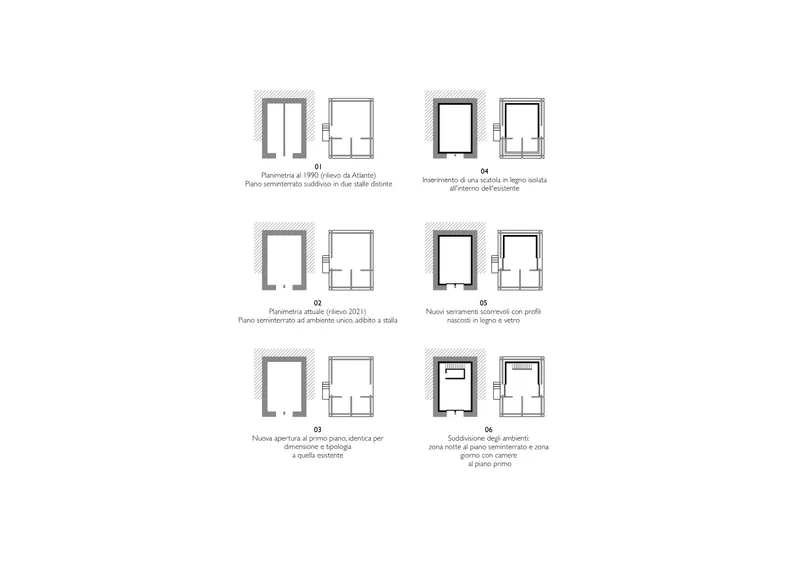 L’intervento prevede la riattivazione del rustico, mantenendo e conservando le sue caratteristiche tipologiche e rispettandone la semplicità dettata dalla funzionalità degli spazi della vita contadina.