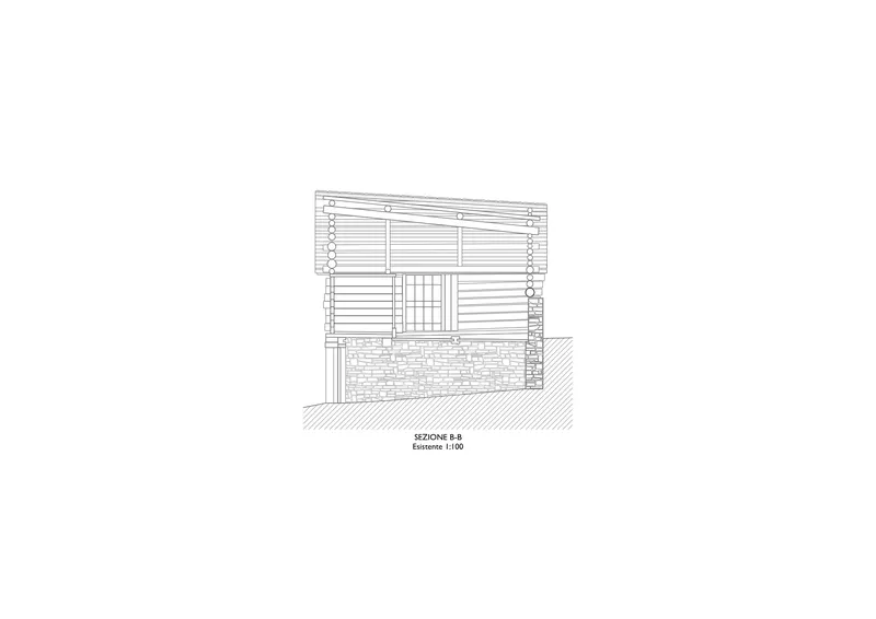 La struttura presenta una netta distinzione materica e funzionale tra basamento in pietra e parte superiore in legno, con un sistema costruttivo tradizionale basato su tronchi squadrati e travi tonde, culminante in una copertura a due falde in piode di gneiss, staticamente autonoma.