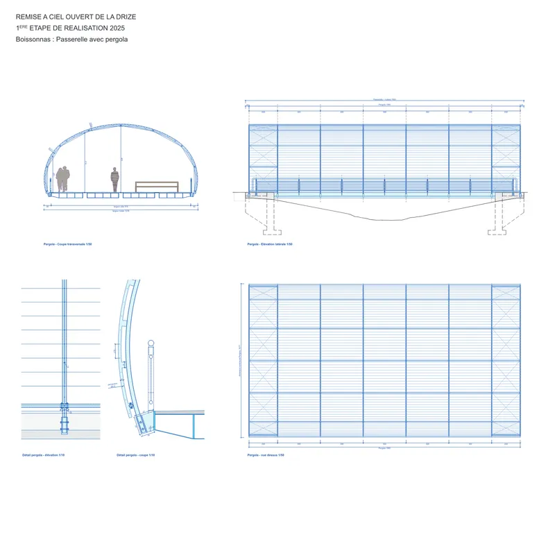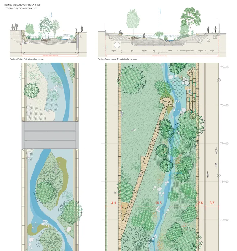 Sur 2,5 km, la rivière remise à ciel ouvert traverse une multitude de situations concernant tant les diversités urbaines actuelles et futures que la composition des sols et sous-sols. Si un minimum de cohérence d’ensemble est recherché par l’établissement de principes d’aménagement généraux, leurs ajustements aux situations locales génèrent une diversification d’aménagements et de rapports à l’eau. C’est par une variation contextuelle que le projet s’ajuste localement et s’enrichit globalement.