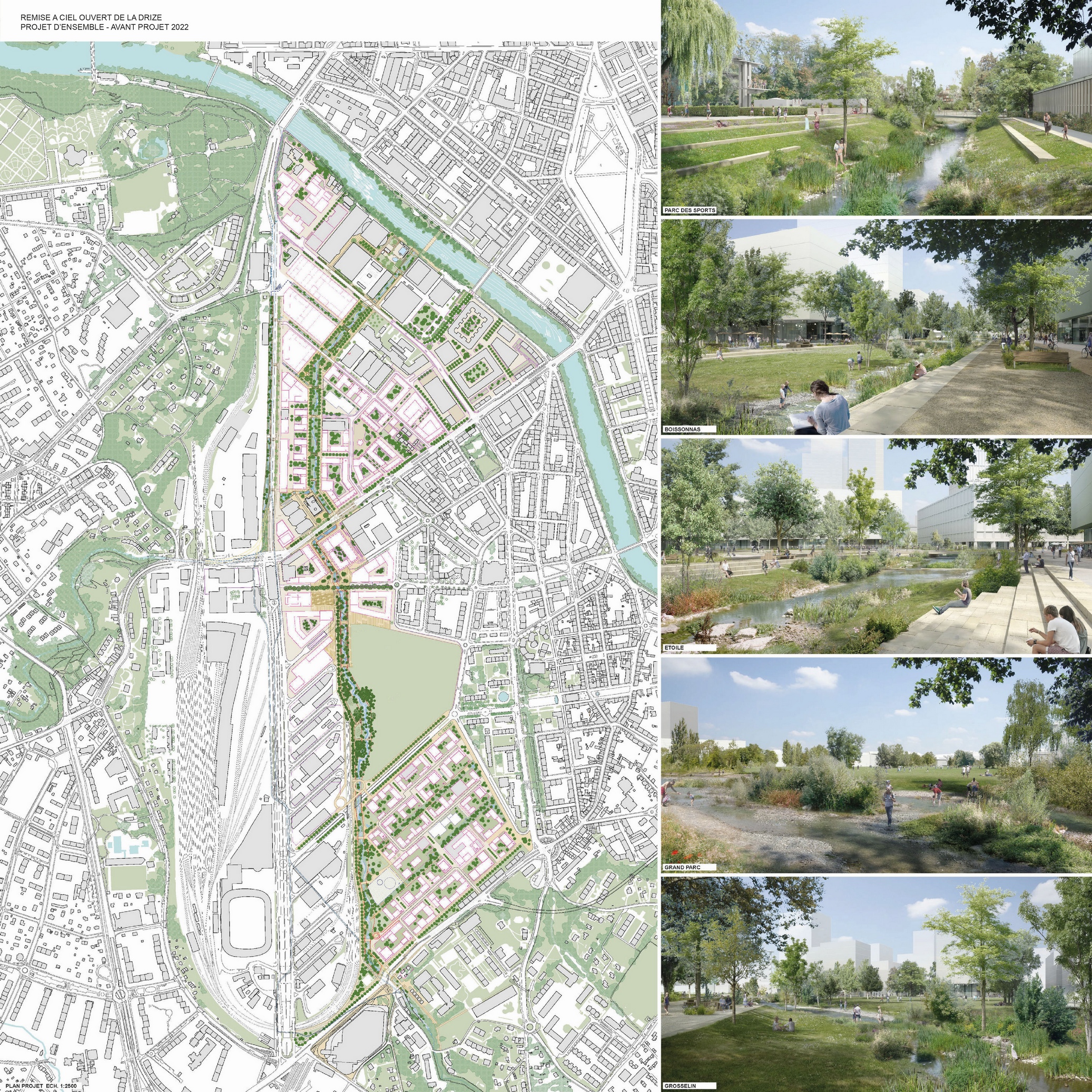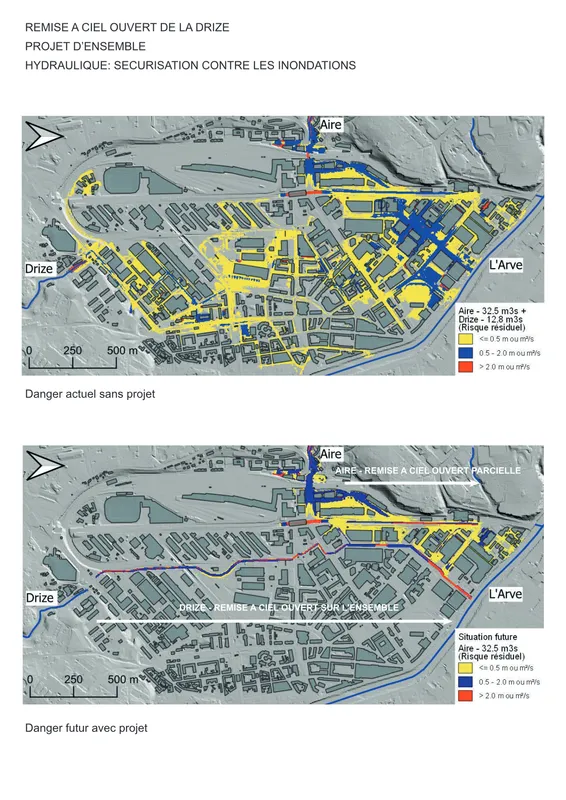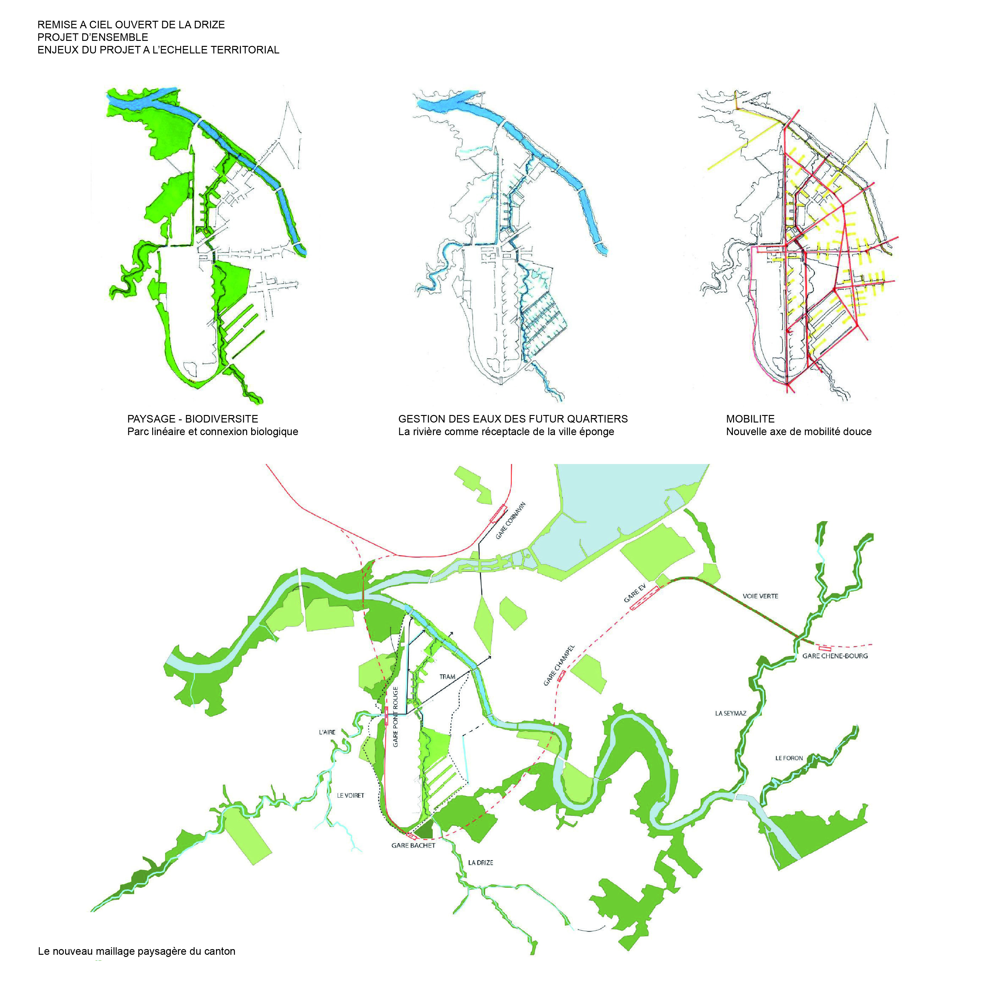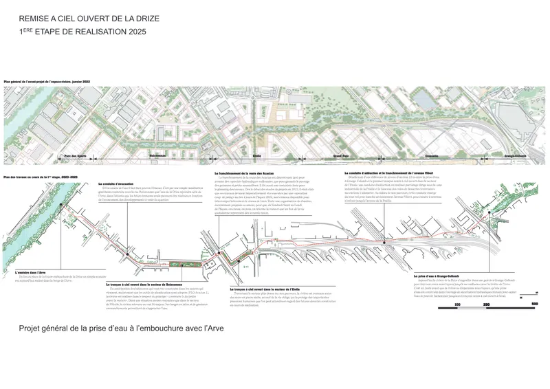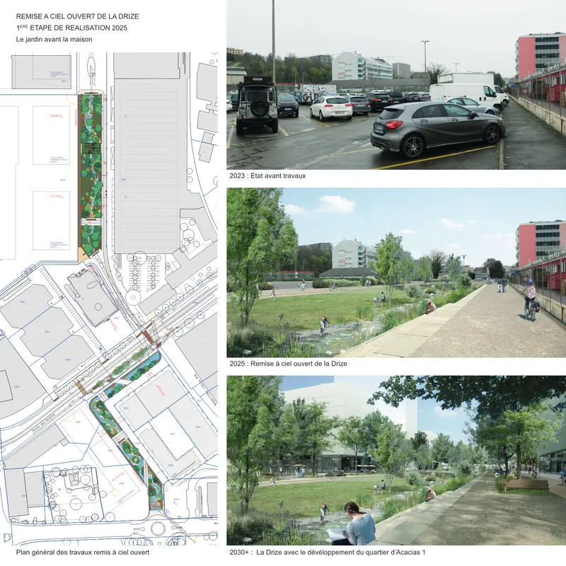 Plus grand monde ne sait qu’avant coulait là une rivière. Au 20e siècle la création de la zone industrielle a fait table rase. Faire ressurgir la Drize au sein de la ville, c’est rétablir une présence enfouie. C’est retrouver une diversité de situations que, par facilité économique, on a fait disparaitre. C’est redonner aux lieux des singularités qu’ils avaient perdues. C’est reconnecter à grande échelle le territoire. C’est penser que demain, on n’imaginera pas que cela ait pu être oublié.