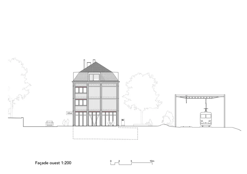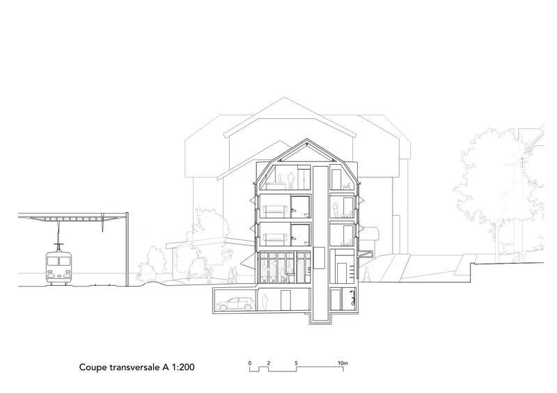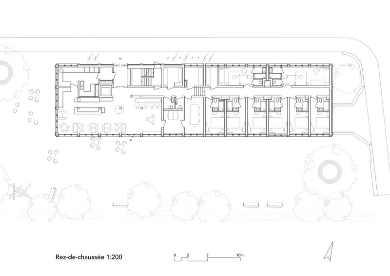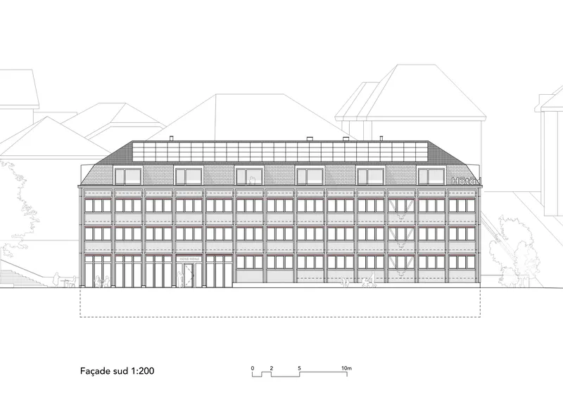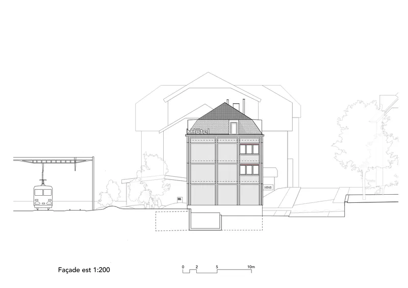 Le projet répond au besoin d’une offre hôtelière adaptée aux besoins touristiques et économiques du Vallon de Saint-Imier. Le rez-de-chaussée ouvert organise de manière lisible les flux piétons entre la gare et le parc, tandis que les niveaux supérieurs garantissent des espaces de séjour calmes et confortables. La préfabrication bois permet une construction rationnelle et durable. L’ensemble du dispositif assure une accessibilité sûre et cohérente pour l’ensemble des usagers.