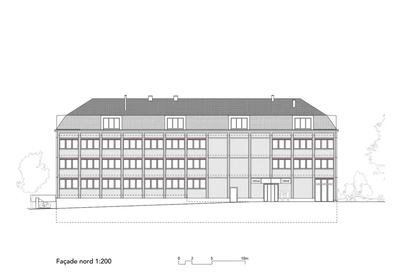 Conscient de la valeur du patrimoine imérien, le projet s’insère en bordure du cœur historique de la ville dans une posture de continuité. La volumétrie simple du bâtiment réinterprète l’archétype des logements d’ouvriers horlogers, tandis que l’expression des façades évoque les ateliers d'horlogerie. Ces références locales, traduites de manière contemporaine, permettent une appropriation du lieu facilitée, porteuse de sens et d’attachement pour les usagers.