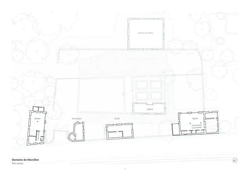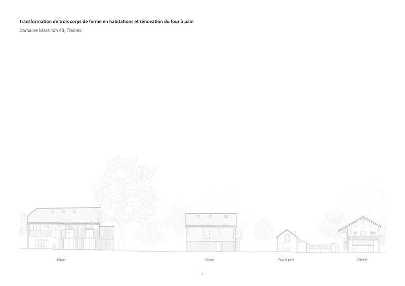 Marsillon s’inscrit dans la continuité historique du domaine et du paysage genevois. L’intervention respecte la volumétrie, les matériaux et les teintes d’origine. Les façades sont recrépies à la chaux, les toitures restaurées à l’identique, et les bardages ajourés réinterprètent les motifs vernaculaires. Le projet s’intègre dans le site sans imitation ni rupture, en prolongeant la cohérence spatiale et culturelle du lieu.