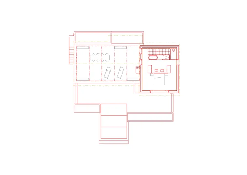 Al primo piano si trova la camera padronale, organizzata attorno a un nucleo centrale in legno e aperta su una terrazza protetta da parapetto pieno e pergola vegetale, concepita come spazio intimo in continuità con il paesaggio e la vegetazione circostante.