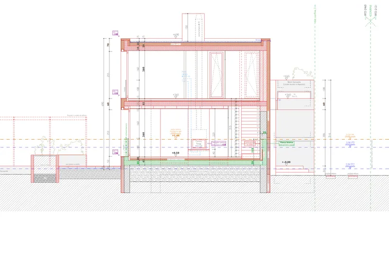 Nel rispetto dell’ampliamento massimo consentito del 30%, si è scelto un approccio compatto e materico, ispirato all’immagine di un cespuglio verde poggiato su una roccia. Questa visione si traduce in un volume “roccioso” alla base, affiancato da corpi in cemento armato che richiamano i massi erratici del delta del fiume Maggia, e da un volume superiore più astratto, definito dal verde della terrazza pergolata, con l’obiettivo di ridurre la percezione dell’edificio nel paesaggio.