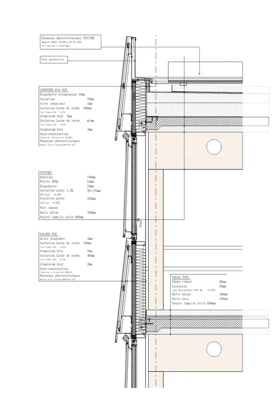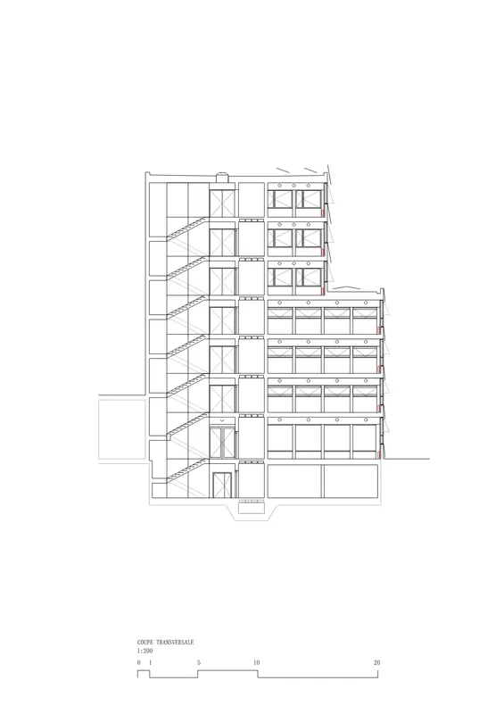 Labellisé THPE, le bâtiment intègre des panneaux photovoltaïques sur les trois derniers niveaux, en substitution du fibrociment, la géométrie de façade contribuant à l’optimisation de leur rendement. Les aménagements intérieurs adoptent un langage brut et artisanal, associant chapes de béton poncées, briques silico-calcaires, bois, panneaux isolants apparents, acier galvanisé et murs en briques de terre compressée. Enfin, une attention particulière est portée au réemploi, avec la récupération de luminaires et de cloisons vitrées issus de bâtiments voués à la démolition.