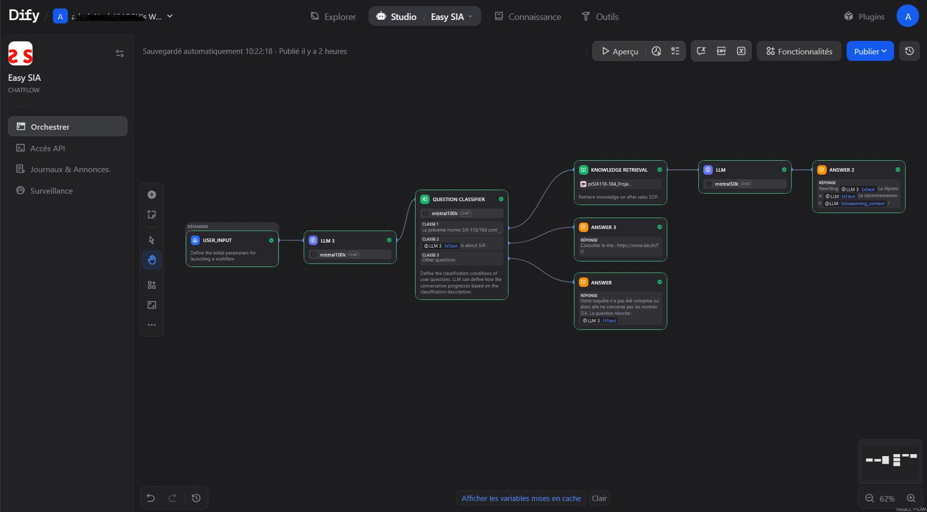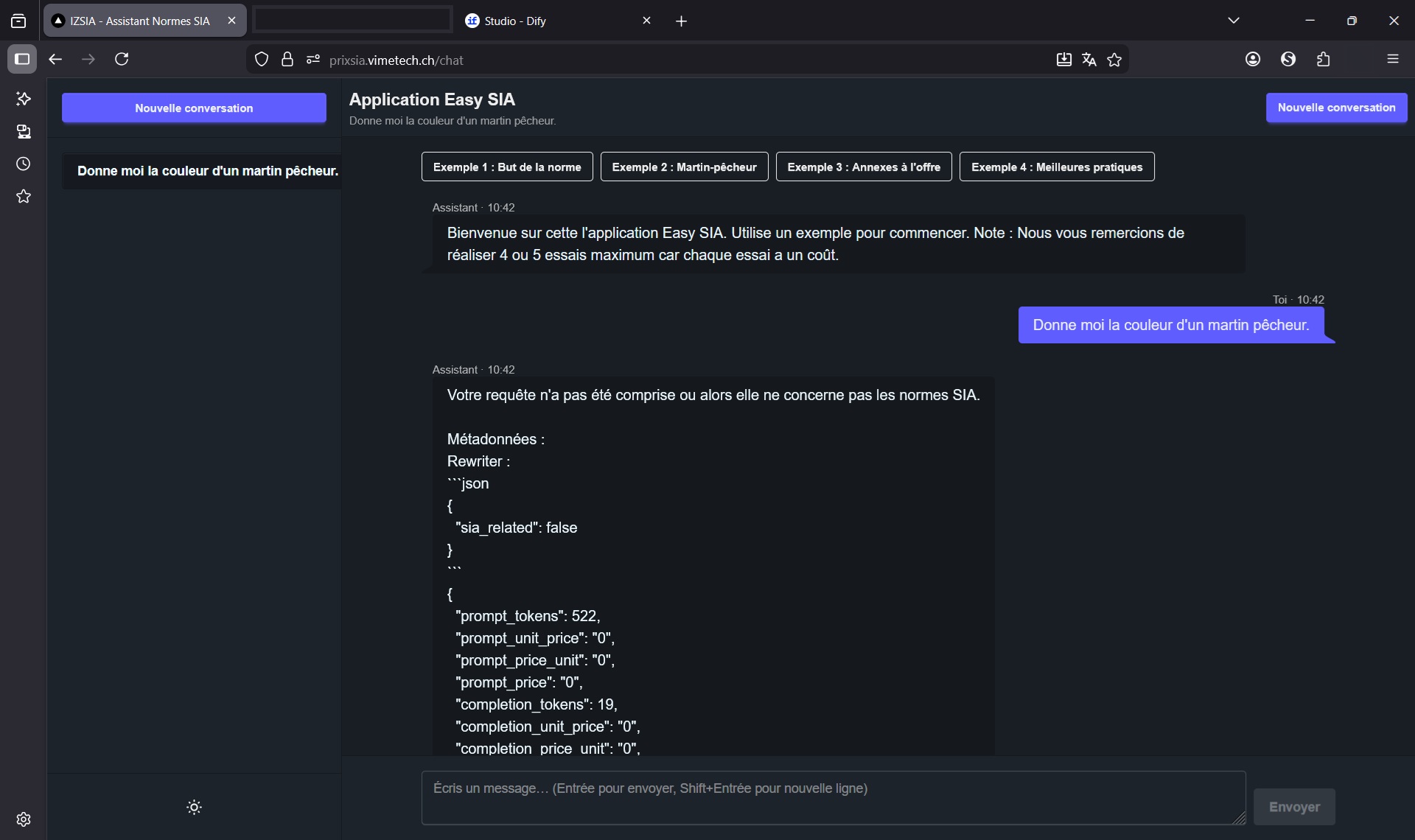 L'ensemble repose sur une architecture 100% suisse : hébergement Infomaniak à Genève, modèle de langage Mistral via Euria, plateforme Dify auto-hébergée. Aucune donnée ne transite hors de nos frontières. La conformité LPD est native, pas ajoutée après coup. L'ensemble de logiciels est "OpenSource" à l'exception de la LLM Mistral.