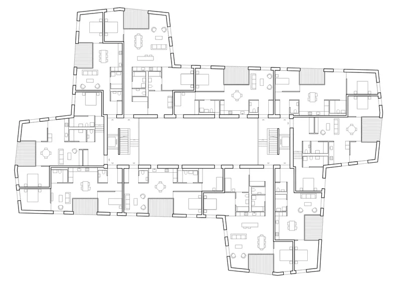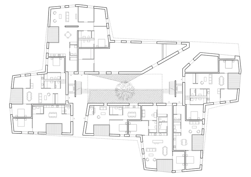 Grâce à sa forme en étoile, le projet propose une grande diversité typologique de logements. Tous les appartements bénéficient de bi ou tri-orientations et sont traversants sur la cour centrale, garantissant qualité d’usage et variété de situations. La diversité typologique, du 2P au 6P, crée un véritable microcosme en sein du bâtiment. La cour et les loggias assurent une relation équilibrée entre espaces semi-publics et privés, favorisant l’appropriation et la diversité des usages.