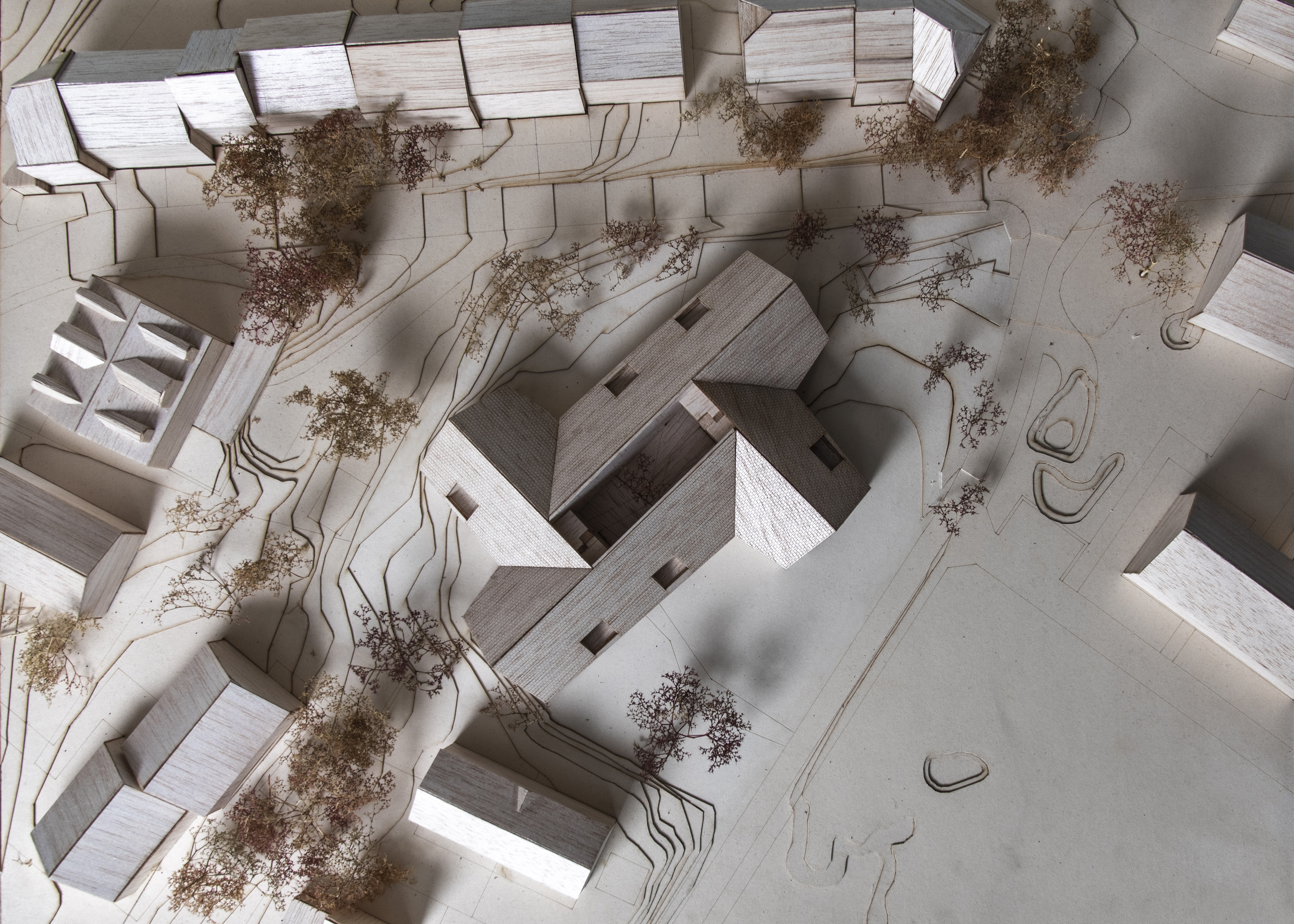 Le projet s’inscrit dans un contexte villageois sensible. Sa volumétrie particulière permet de réduire son impact visuel. Le bâtiment n’est jamais perçu dans son ensemble, ce qui atténue la lecture de son échelle et favorise une meilleure intégration. Cette fragmentation volumétrique permet également une mise à distance judicieuse avec le voisinage proche. Enfin, les dégagements générés autorisent une végétalisation périphérique généreuse du site ainsi que de la cour.