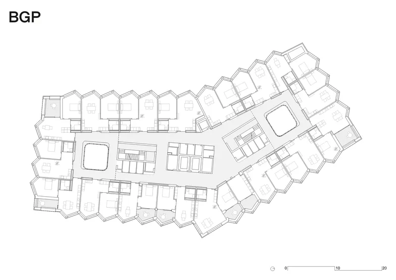 Der polygonale Baukörper klärt eine diffuse städtebauliche Situation und formt zur Strasse hin einen neuen Platz. Das Erdgeschoss öffnet sich mit Café und Gemeinschaftsangeboten bewusst nach aussen und macht das Haus für Bewohnende wie für das Quartier zugänglich.