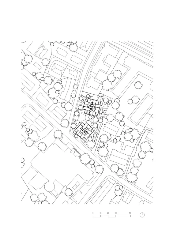 Zusammen mit den Nachbarn um das denkmalgeschützte Ortsmuseum Altstetten bildet das Projekt ein Ensemble und erweitert den Betrachtungsperimeter über die Parzellengrenze hinaus. Das Hallenbad Altstetten bleibt in dieser Konstellation die grossmassstäbliche Ausnahme im Quartier.