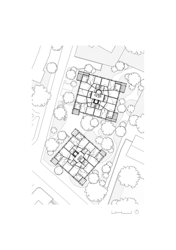 Am Zürcher Kelchweg entstehen zwei genossenschaftliche Punkthäuser, die 2019 als Sieger aus dem städtischen Wettbewerb hervorgegangen sind. Die Gebäude fügen sich in ein durchgrüntes Quartier in direkter Nachbarschaft zum geschützten Ortsmuseum und dem grossmassstäblichen Hallenbad Altstetten. Ihre zueinander gedrehte Anordnung und ihre gegeneinander versetzten Balkone schaffen einen Dialog zwischen den Baukörpern und binden bestehende Aussenräume des Quartiers ein.