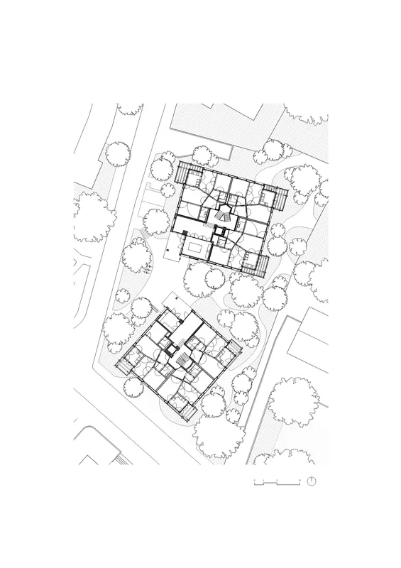 Im Grenzgebiet zwischen den geschlossenen Baukörpern und dem kleinmassstäblichen und wohnlichen Kontext unterstützt das Projekt die Sichtweise eines durchgrünten Quartiers über Körnung und Aussenraumstruktur.