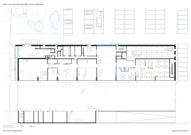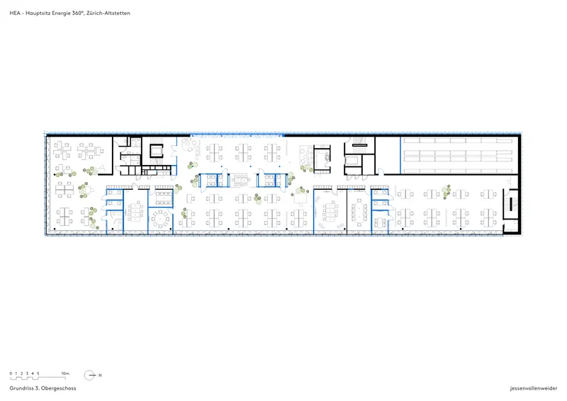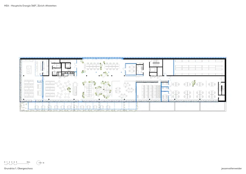 Das Bestandsgebäude von Energie 360° aus dem Jahr 2003 wurde behutsam weiterentwickelt und in eine moderne, flexible Arbeitswelt transformiert. Ziel war die Aufwertung des architektonischen Erscheinungsbildes und die Umgestaltung der Innenräume zu einer offenen, kollaborativen Bürolandschaft. Mit 330 Desksharing-Arbeitsplätzen bietet das Konzept ca. 400 Mitarbeitenden eine funktionale Arbeitsumgebung, ergänzt durch zentrale Begegnungszonen wie Personalrestaurant, Coffee Point und Marktplatz. Die Schliessung des ehemaligen Lichthofs stärkt den Baukörper und schafft eine identitätsstiftende Struktur, die zugleich Raum für zukünftige Entwicklungen eröffnet.