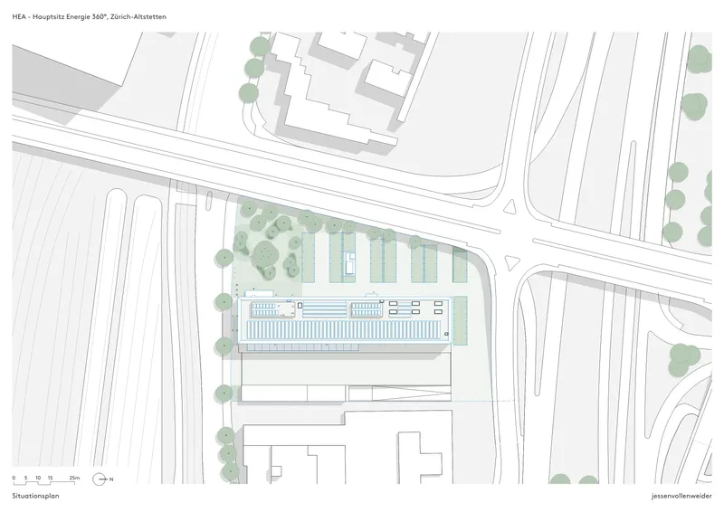 Der Hauptsitz nimmt in einem dynamisch wachsenden, gemischt genutzten Quartier zwischen Autobahn und Gleisraum eine prägnante städtebauliche Position ein. Zur Stärkung der Aufenthaltsqualität und der städtischen Einbettung wurde der Anteil öffentlich zugänglicher Freiräume erhöht. Der neue Haupteingang wird durch einen baumbestandenen Stadtgarten akzentuiert und belebt zugleich das Erdgeschoss. Eine Fassadenbegrünung aus klimaadaptiven Rankpflanzen entlang des Sockelbereichs schafft eine grüne Verbindung zwischen Aussenraum und Gebäude und wirkt als ökologischer sowie räumlicher Filter. Biodiversitätsfördernde Massnahmen verbessern das Mikroklima nachhaltig und stärken die ökologische Qualität des Quartiers.