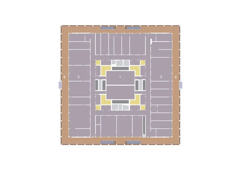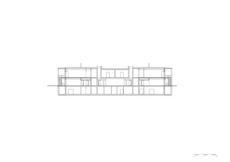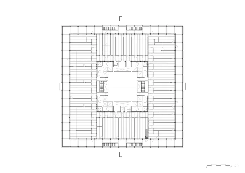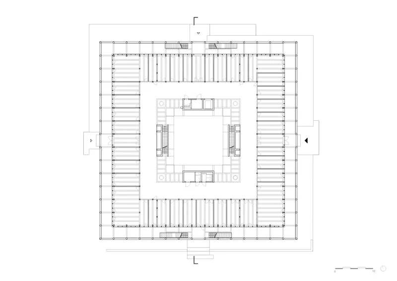 Umlaufende Laubengänge schaffen Orte der Begegnung. Im Erdgeschoss bieten Sitzbänke unter dem Laubengang Raum für Aufenthalt.  Mitarbeiter, Nachbarn, Schüler oder Passanten nutzen den Ort für Begegnung oder Kontemplation. Die Laubengänge lösen die hermetische Grenze eines reinen Zweckbaus auf und vernetzen den Verwaltungsbau mit der Nachbarschaft. Das mittige Forum im Inneren bietet Raum für Austausch über Abteilungsgrenzen hinweg.