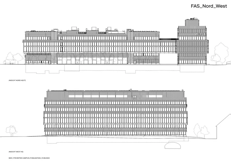 Der Neubau für den Hauptsitz der Rieter AG bildet einen markanten Kopf an der Stadteinfahrt in Winterthur Töss. Das neue Technologiezentrum und das Bürogebäude bilden eine Einheit, die linearen Volumen sind auf zwei Geschossen miteinander verbunden, der Austausch unter den Mitarbeitenden wird gefördert.