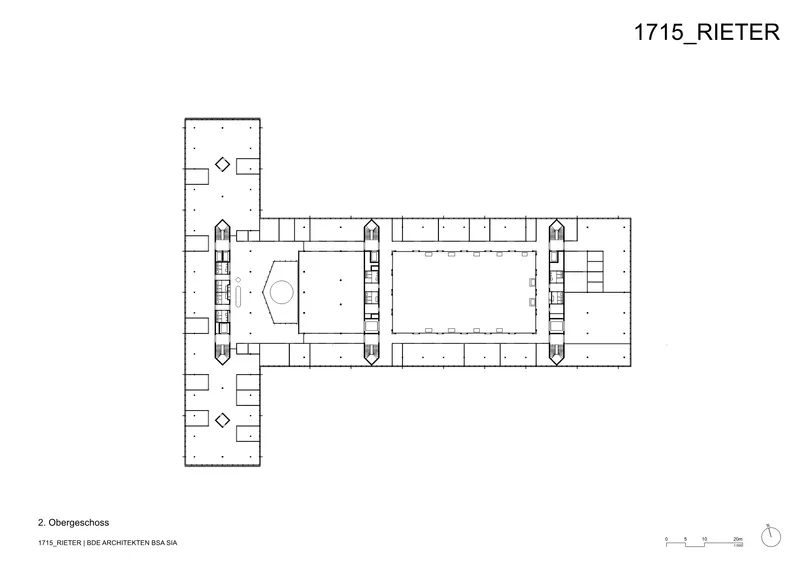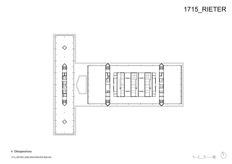 Neu ist die Öffnung des Areals: Im Erdgeschoss werden Spinnmaschinen wie Preziosen in einem Showroom gezeigt, darüber liegen introvertierte Forschungs- und Entwicklungshallen ohne Einblick. Eine flexible Stützenstruktur ist Grundlage des Grundrisses. Drei Raumstreifen gliedern den Forschungsbereich quer und den Bürobau längs und teilen die zenital belichteten Hallen in unterschiedlich große Einheiten. Die Lasten des Baukörpers werden über ein elaboriertes Tragwerk und Baumstützen abgeleitet.