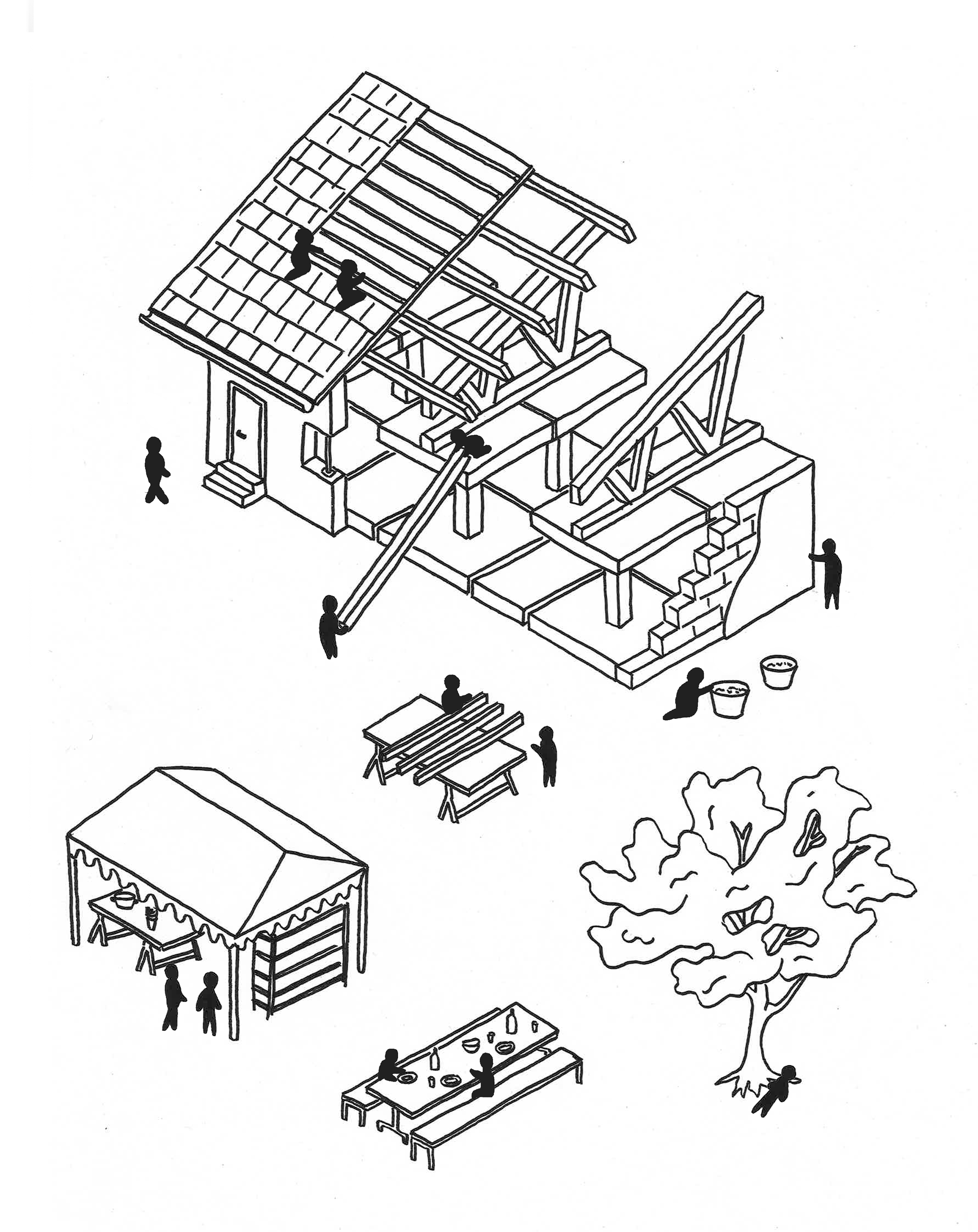 La beauté de ce projet est le succès d’une telle ambition, en gouvernance partagé, porté par des étudiant.e.s, tout en incluant la communauté au sens large. Parallèlement, le pavillon en soi est un témoignage de l’inestimable attention portée par tou.te.s. Cet espace simple, ponctué des imposantes colonnes champignons en réemploi de béton, léché d’enduits de terre et de chaux, protégé de tuiles de réemploi, peintes par des écoliers, etc. sont autant de belles pistes constructives explicites.