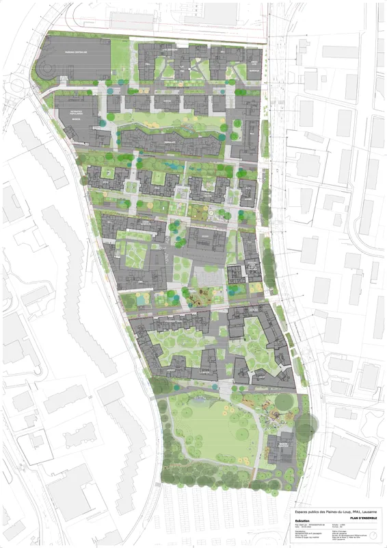 Le projet organise le quartier selon le concept lauréat du concours d'urbanisme (2011) «ZIP » explicitant la volonté de relier le nouveau quartier à son contexte par un réseau d’espaces publics (rues, espaces verts), le but étant de préserver la continuité du maillage vert propice à la biodiversité. Cette structure urbaine vise d'une part à homogénéiser le nouveau quartier avec le bâti existant tout en donnant une identité propre à chaque lieu par un traitement circonstancié de l'espace public.