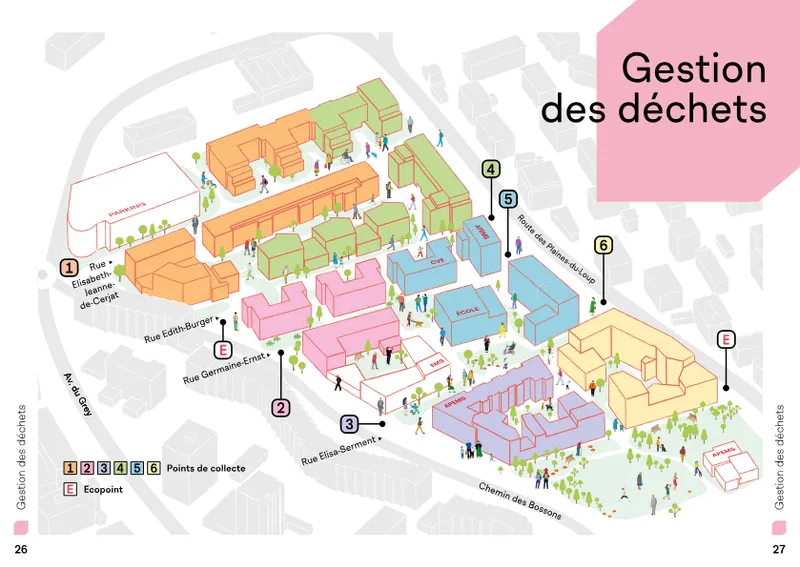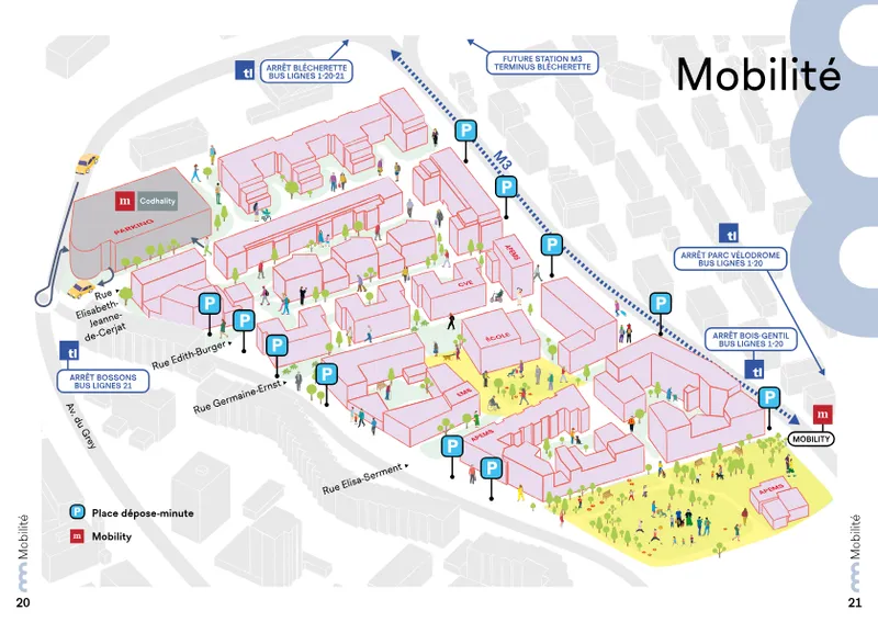 Les espaces publics sont conçus pour assurer confort (bancs, zones ombragées), sécurité (visibilité) et accessibilité (chemins conformes aux normes PMR, places de jeux accessibles).