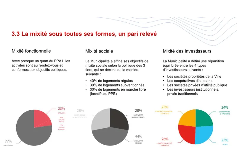 - Règle des 3/3 assurant la présence de 30% de logements subventionnés (LLM), 40% de log. régulés (LLA) et 30% de log. en marché libre dont de la PPE appliquée à une échelle fine. Les logements ont des tailles variées adaptées à des ménages divers