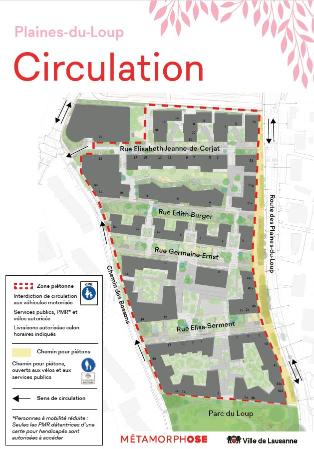 Lausanne, Rues Elisabeth-Jeanne-de-Cerjat / Edith-Burger / Germaine-Ernst / Elisa-Serment ; Route des Plaines-du-Loup ; Parc du Loup